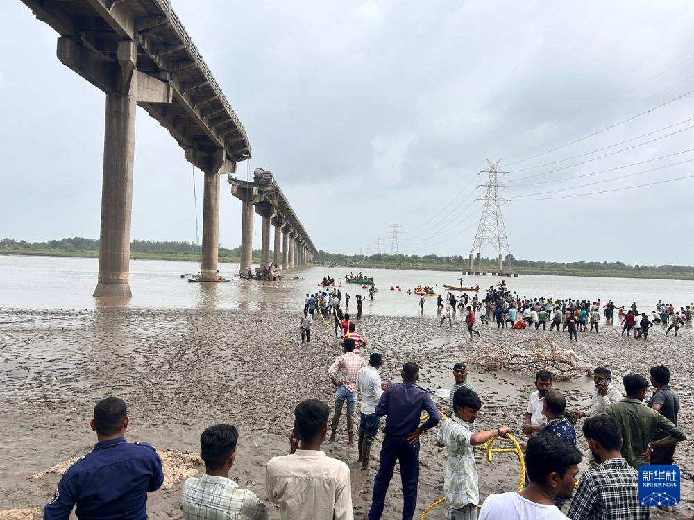 7月9日,救援人员在印度西部古吉拉特邦垮塌的桥梁旁开展救援行动。新华社/印度联合新闻社