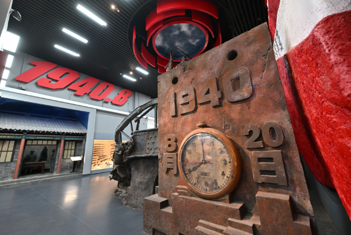 参观结束,习近平总书记来到纪念馆大厅,同青少年学生和纪念馆工作人员亲切交流。在他们身侧,“百团大战 光耀千秋”八个字熠熠生辉,一组以娘子关战斗、狮脑山战斗、正太铁路破袭战等为主题的群雕气势磅礴,再现了那段烽火连天的岁月。