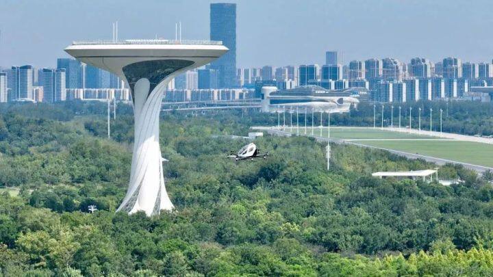 7月2日,一架电动垂直起降飞行器(eVTOL)在合肥骆岗公园演示飞行(无人机照片)。新华社记者周牧摄