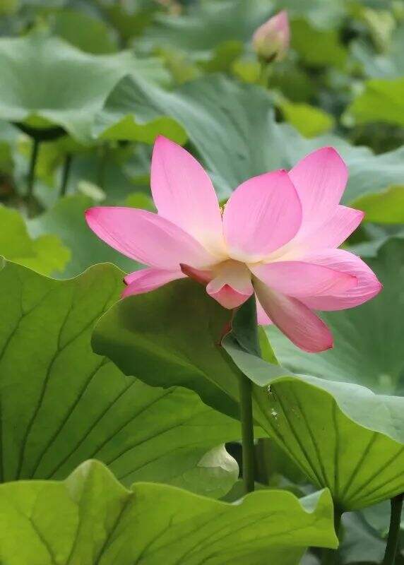 碧叶托着玉雕般的露珠,粉荷亭亭玉立