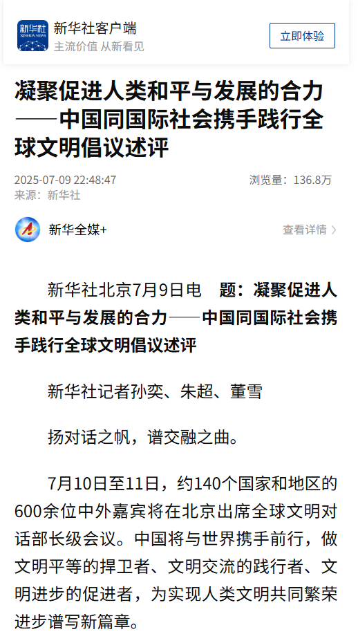 7月9日,新华社发布《凝聚促进人类和平与发展的合力——中国同国际社会携手践行全球文明倡议述评》一文。
