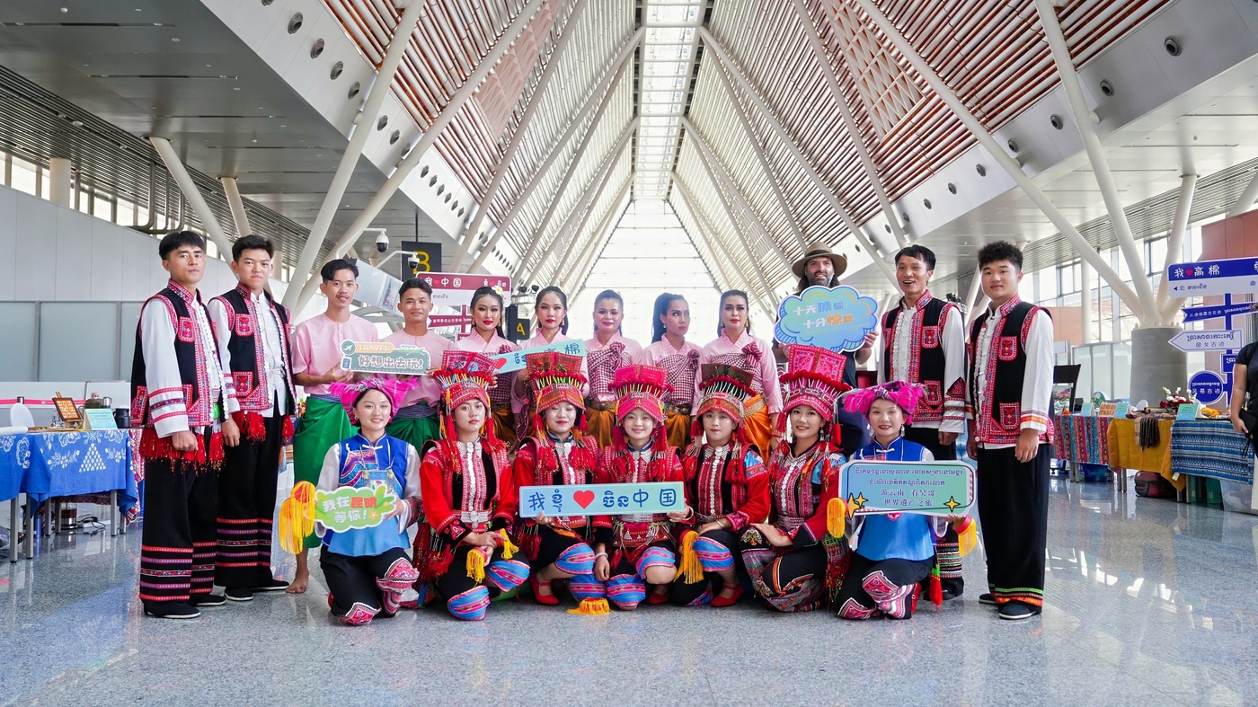 德宏展演人员向柬埔寨展商赠送绣包。主办方供图