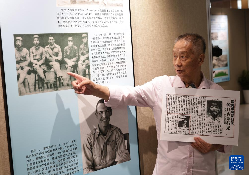 7月8日,因救助美军飞行员被日本侵略者杀害的上海浦东临浦村保长薛和尚的侄孙薛耀忠,在图片展上讲述薛和尚救助飞虎队队员的故事。