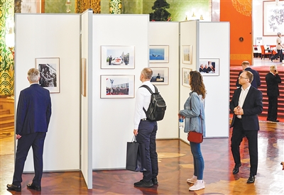 2025年4月18日,在俄罗斯首都莫斯科,嘉宾参观纪念中国人民抗日战争暨世界反法西斯战争胜利80周年图片展。
