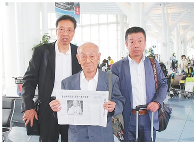 2015年9月,小林宽澄(中)、小林宪明(右)向记者展示人民日报对小林宽澄的报道。