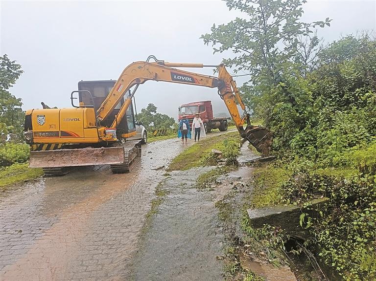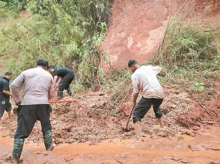 冲锋在前,争当抢险“急先锋”。暴雨稍歇,全乡迅速摸排灾情,发现章遮路至尹帽乡道4处涵洞堵塞,导致大面积路面水淹;章遮路营盘村岳岛新寨至尹帽新寨路段有2处道路塌方,易引发泥石流;沿江路9公里处被塌方土石完全阻断。面对险情,勐约乡充分发挥党建引领作用,凝聚全乡力量投入保通工作。乡消防队员火速前往广瓦村广瓦山小组至汉三社村道,清理倒塌树木;各村“两委”班子、驻村工作队第一时间赶赴灾害点,拉彩带设置警示标志、逐户通知村民注意安全;党员干部带头,与群众一起拿起镰刀、锄头疏通道路;挖掘机等专业机械也迅速到位,争分夺秒抢修中断道路。经过日夜奋战,除坍塌特别严重的路段外,主要乡道恢复正常通行,保障了群众的基本出行需求。
