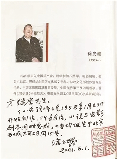 方继孝回忆,他与徐光耀先生在30年前开始交往,并结下忘年交。起初引起他注意的是徐光耀1958年日记里的一句话,“从今天起,开始写中篇小说刘故得儿的故事。”日记最后还有一句话,“张故得儿的故事已经完成初稿。”方继孝知道“故得儿”这词在北京话里是“老疙瘩”“老儿子”的意思,在河北方言里还有调皮捣蛋的意思。《小兵张嘎》究竟是在哪里孕育出生的?方继孝后来研读《徐光耀日记》发现,小说《小兵张嘎》初拟提纲时的名字叫“刘故得儿”。梗概完成后,改为“张故得儿”。最后定稿时,书名《小兵张嘎》。2021年,徐光耀在纪念《小兵张嘎》公开发表60周年海报签字并附赠手书时,向方继孝确认,《小兵张嘎》是1958年1月23日开始创作,在北京西城延寿寺街的大耳胡同15号完成的。