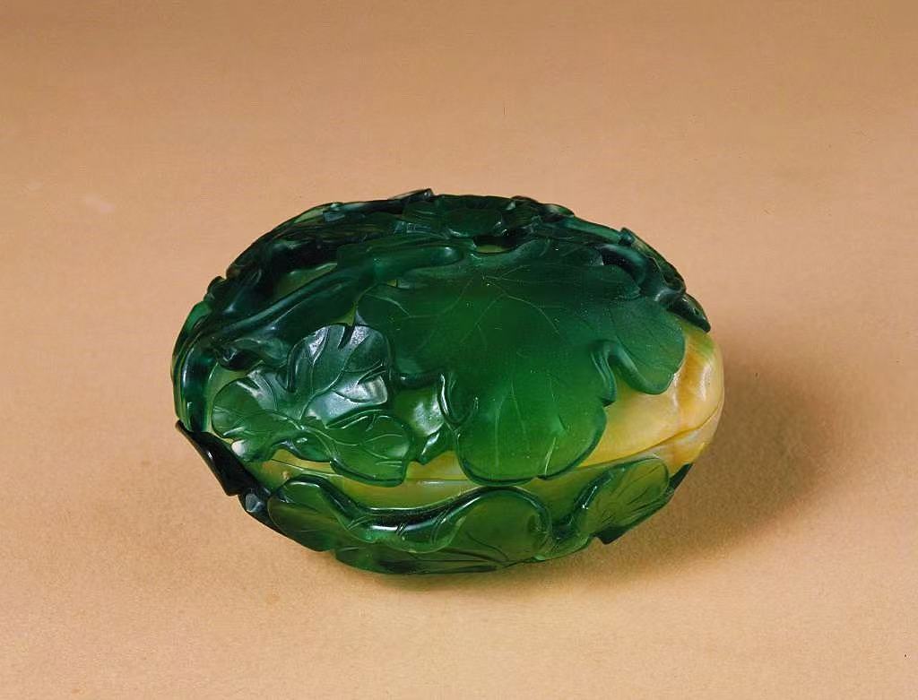 北京故宫博物院收藏了一件黄套绿玻璃瓜形盒,盒高4.7厘米,口径长7.7厘米、宽8.3厘米,制作于清代晚期,属小件玩赏之作,当文房器物用之亦相宜。此盒分盒盖、盒底两部分,整体合拢后为一个扁圆甜瓜形器。器胎用淡黄色玻璃制成,胎中呈现出黄为主红为辅二色相间的搅丝纹。外套饰绿色透明玻璃,雕刻成瓜叶形,藤蔓突出,叶脉清晰,花瓣舒展。近看,叶上爬着的甲虫以同色绿玻璃制出,覆饰在甜瓜形胎上,把玩中颇能引人注意,确为此盒之点睛妙笔。黄色的甜瓜、绿色的花叶、光洁的瓜胎、自然的叶状纹饰,其用色、造型均能看出设计立意之巧妙,同时,反映出制作者采撷生活素材的修养以及熟谙玻璃制造工艺的功力。此盒由清代内务府养心殿造办处玻璃厂烧造,借鉴了玉器工艺中的“巧色”手法来处理此器,给人一种淡雅脱俗之感。