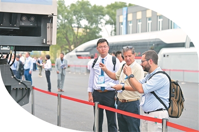 7月11日,第十二届世界高铁大会技术参观活动现场,参会代表乘坐CR400BF-GS复兴号技术提升型智能动车组,体验京张高铁的运营服务。王 玮摄(人民图片)