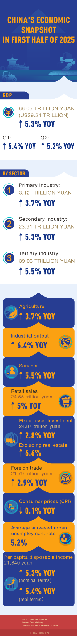 China released a slew of key economic data for the first half of 2025. Its GDP grew 5.3% year on year, while industrial output went up 6.4%, beating expectations.