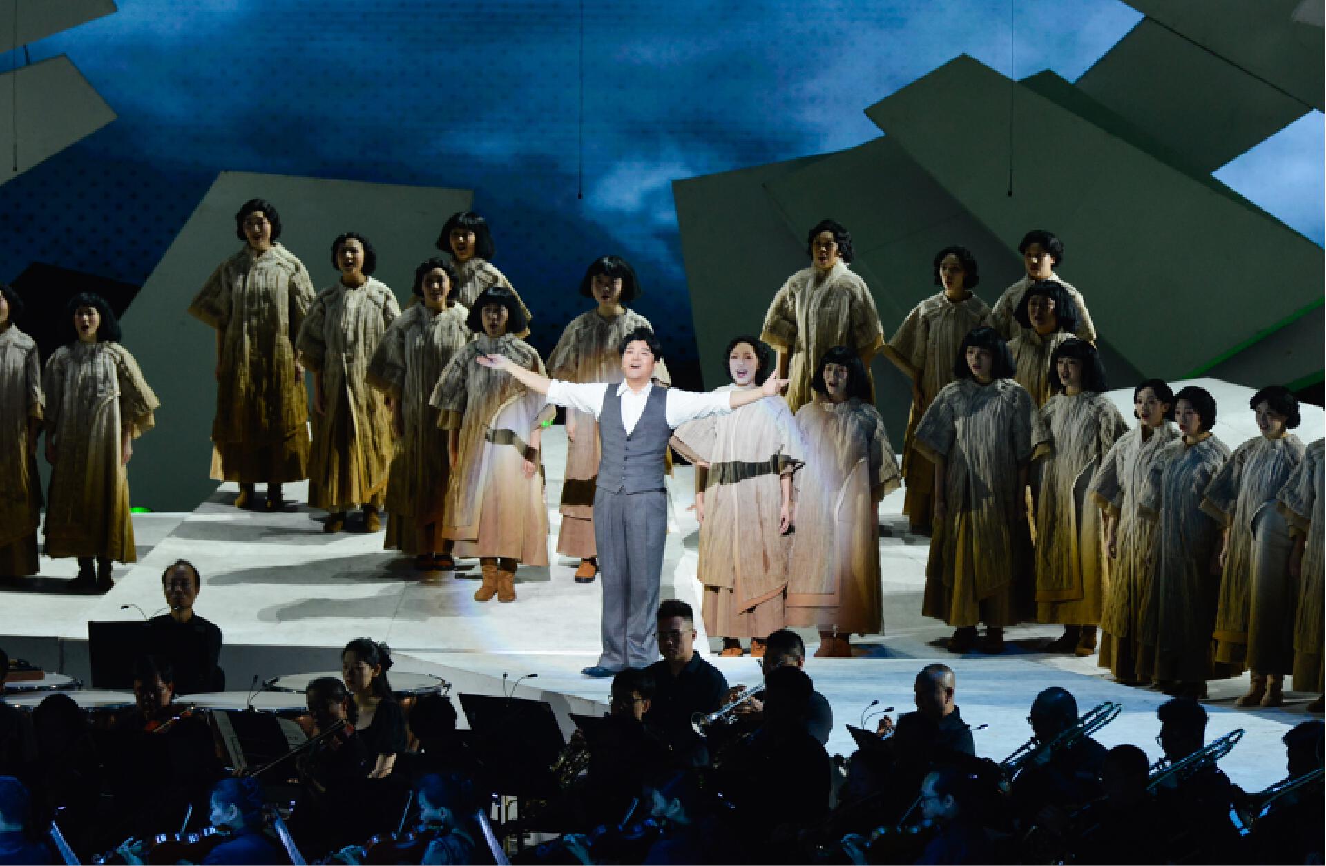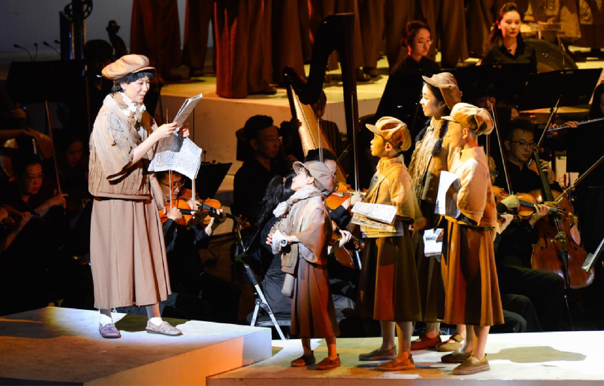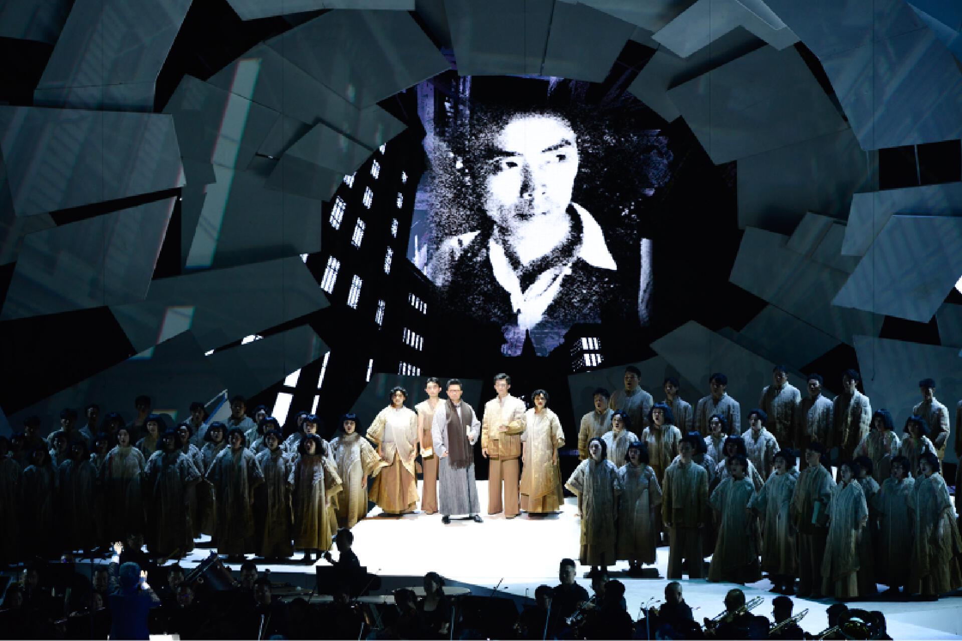 首演现场,《聂耳的歌》以人民音乐家聂耳生平为主线,包括《序曲》《童年时光》《我之人生观》《码头工人歌》《卖报歌》《铁蹄下的歌女》《毕业歌》《义勇军进行曲》等篇章,精选聂耳经典作品,通过“合唱+交响乐+戏剧+多媒体”多元艺术融合的创新形式,构建“历史-奋斗-未来”三大叙事篇章,以创新舞台语汇再现聂耳短暂而炽热的生命史诗,展现中国革命音乐的永恒魅力,讲好“聂耳和国歌的故事”。该剧生动勾勒了聂耳艺术与信仰交织的壮阔图景——从《牧羊曲》的灵感启蒙,到上海街头以《卖报歌》《大路歌》为劳苦大众呐喊,更聚焦1935年那个永恒瞬间——聂耳主动请缨为田汉写在香烟纸上的诗行谱曲,将原词末句凝练升华为“冒着敌人的炮火前进!前进!前进!进!”,雷霆般的旋律喷薄而出。