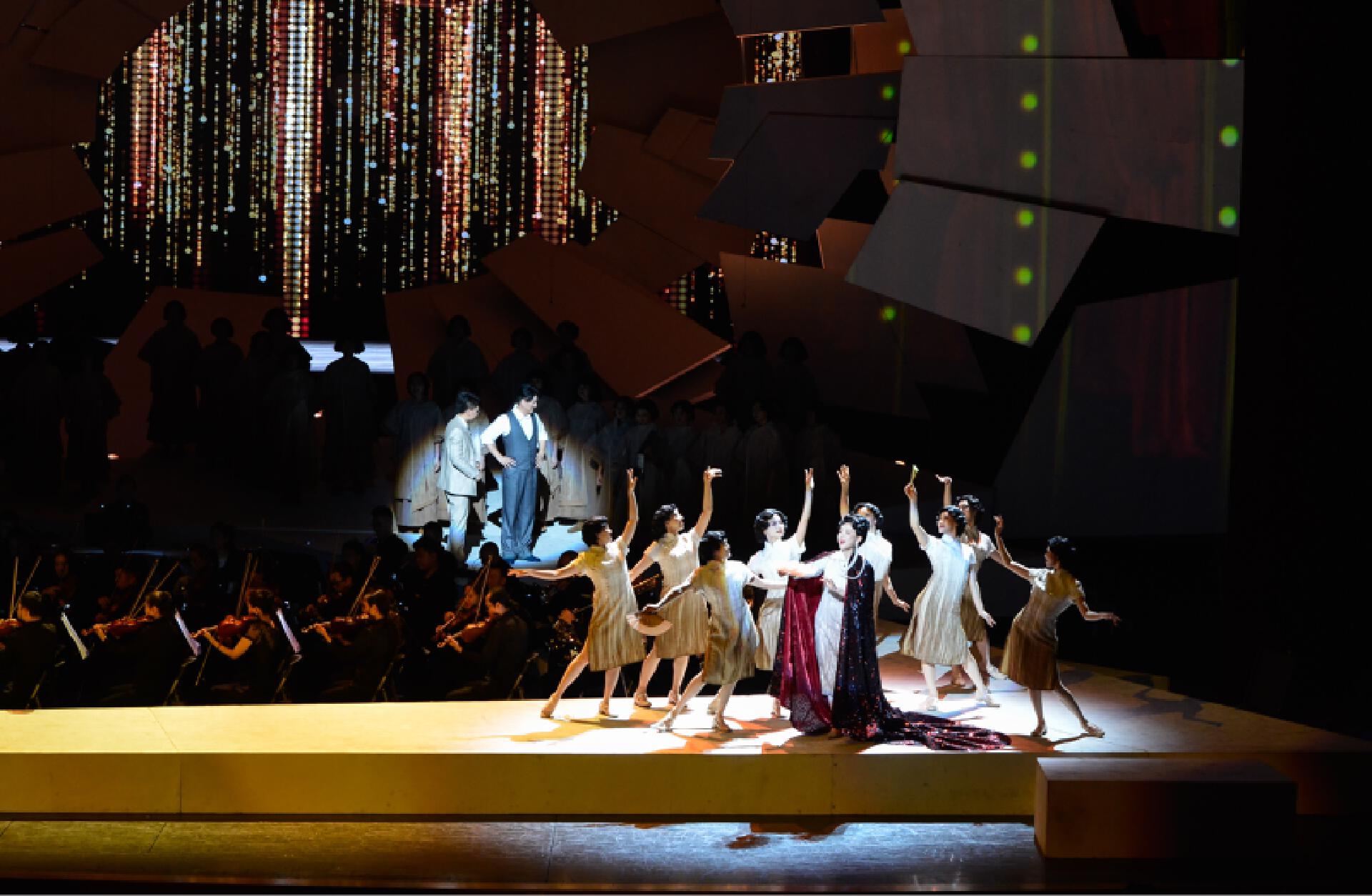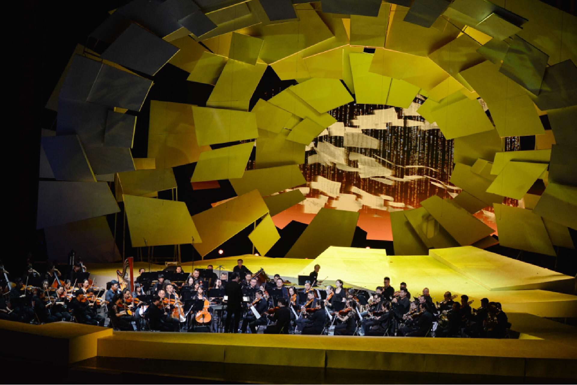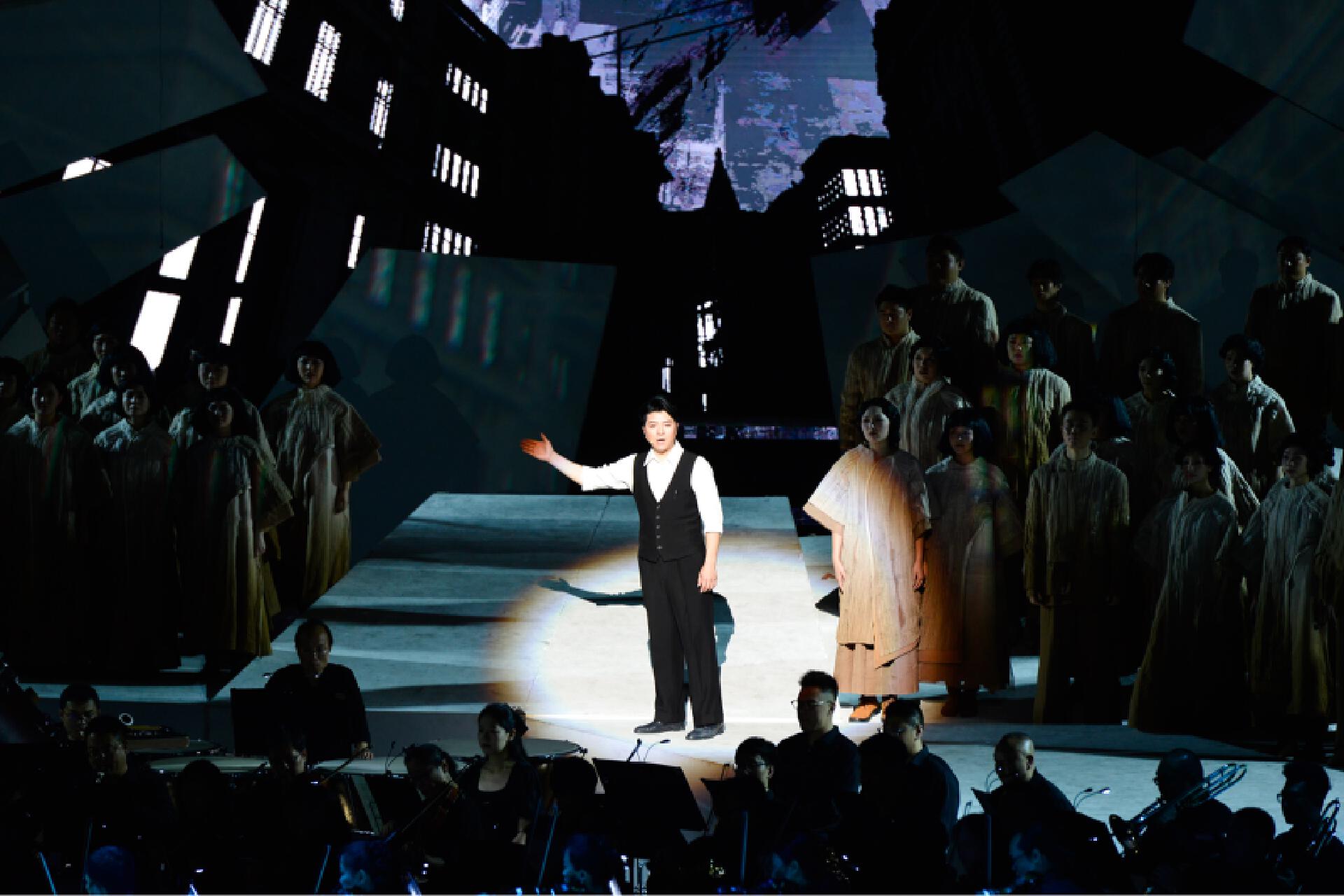 首演现场,《聂耳的歌》以人民音乐家聂耳生平为主线,包括《序曲》《童年时光》《我之人生观》《码头工人歌》《卖报歌》《铁蹄下的歌女》《毕业歌》《义勇军进行曲》等篇章,精选聂耳经典作品,通过“合唱+交响乐+戏剧+多媒体”多元艺术融合的创新形式,构建“历史-奋斗-未来”三大叙事篇章,以创新舞台语汇再现聂耳短暂而炽热的生命史诗,展现中国革命音乐的永恒魅力,讲好“聂耳和国歌的故事”。该剧生动勾勒了聂耳艺术与信仰交织的壮阔图景——从《牧羊曲》的灵感启蒙,到上海街头以《卖报歌》《大路歌》为劳苦大众呐喊,更聚焦1935年那个永恒瞬间——聂耳主动请缨为田汉写在香烟纸上的诗行谱曲,将原词末句凝练升华为“冒着敌人的炮火前进!前进!前进!进!”,雷霆般的旋律喷薄而出。