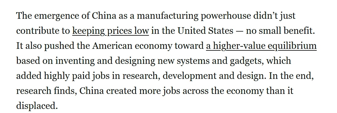 文章进一步指出,现在美国政府依旧秉持的政治逻辑为:任何对美国存在双边贸易顺差的国家皆是敌手。比如,与中国的市场竞争,成了为美国经济筑起高墙的依据,这恰恰是最为错误的应对方式。中国带来的竞争压力实则助推了美国经济转型。从宏观层面看,中国提供的中间品为美国创新型企业带来了巨大利润,同时提升了其他美国企业的全球竞争力。中国成为制造业强国不仅平抑了美国物价,更推动美国经济向以创新设计驱动的高附加值形态转型,研发设计领域由此新增大量高薪岗位。研究表明,中国对美经济创造的就业岗位最终远超其替代的岗位数量。