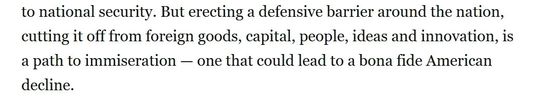 文章最后援引业内人士的话说,美国如果筑起全面防御壁垒,切断商品、资本、人才及创新理念的国际流动,终将走向经济衰退,这或将真正导致美国衰落。