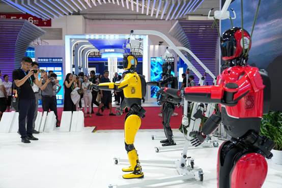 7月17日,在第三届链博会数字科技链展区,参观者观看人形机器人表演。新华社 记者鞠焕宗 摄