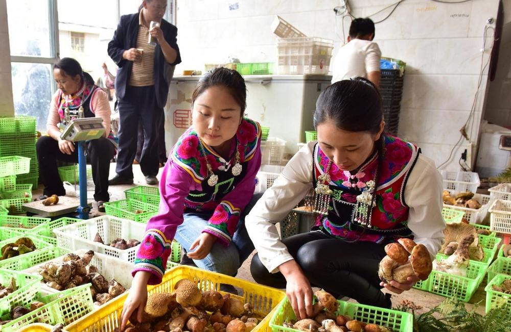村民在南华县五街镇的野生菌收购点分拣菌子。