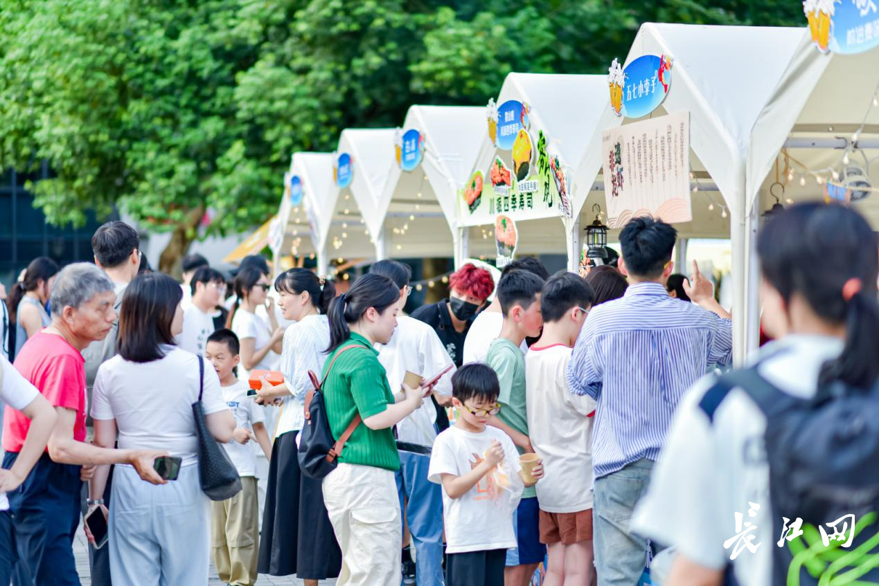 肯悦咖啡的展位前同样排起长队,店员正忙着制作招牌气泡咖啡。活动现场,30余家商户集体放“价”,百丽宫影院免费发放的观影券成为“纳凉锦囊”,中化石油(滨江加油站)派发优惠券为活动加码,雾山观·川派四季寿司、PUPUwoo噗噗屋、5号面包房子等网红美食悉数登场,吃喝玩乐购一站式配齐。