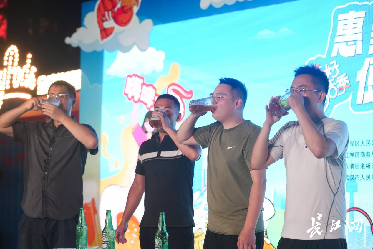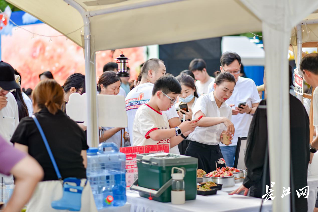 “武汉的夏天,啤酒配着油焖大虾才够味!”傍晚6点,家住江岸区永清街道新天地社区李女士刚在巴厘龙虾的展位品尝完大虾,又被雪花啤酒的“微醺派对”包围。她举着手机拍下热闹的人群,发送到小区微信群里:“快下楼,今晚又有好玩的活动!”