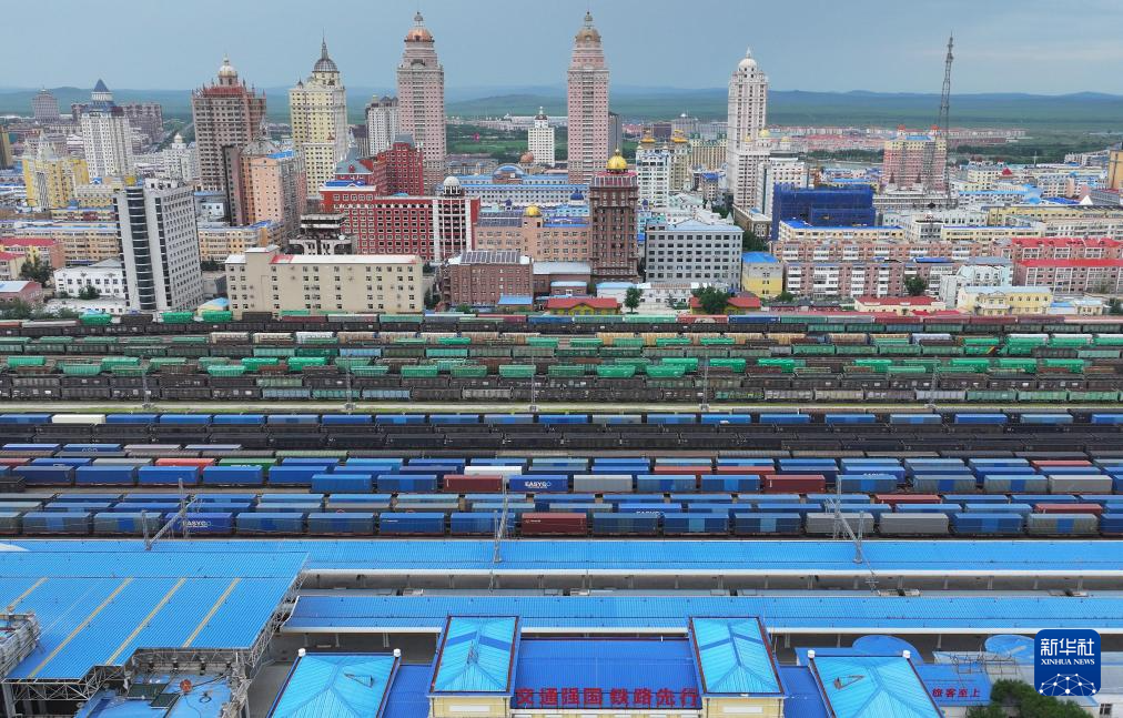 6月17日,中国铁路哈尔滨局集团有限公司绥芬河站南站场,满载货物的入境列车等待解体换装(无人机照片)。2025年上半年,经中欧班列东通道通行班列达2444列,发送货物252340标箱。中欧班列东通道由满洲里、绥芬河、同江铁路口岸组成,截至目前通行线路已达27条,可通达波兰、德国、荷兰等14个国家,通往我国长沙、郑州、成都、苏州等60余个城市,成为中国与“一带一路”沿线国家互联互通互惠的重要载体。