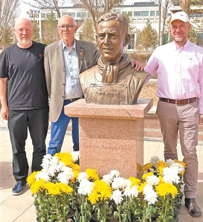 马克·艾尔温·托马斯(左二)在乔治·何克的雕像旁合影留念。作者供图