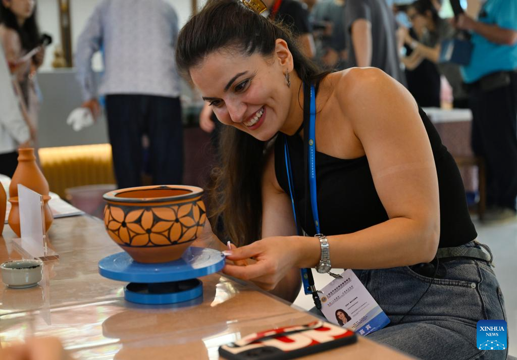 A participant of the Shanghai Cooperation Organization (SCO) Media and Think Tank Summit tries her hands coloring a pottery artifact at a liquor company in Mianchi County of Sanmenxia, central China's Henan Province, July 23, 2025. The SCO Media and Think Tank Summit is held in Zhengzhou from July 23 to 27. Participants are invited to visit various locations in Henan during the summit. (Xinhua/Hao Yuan)