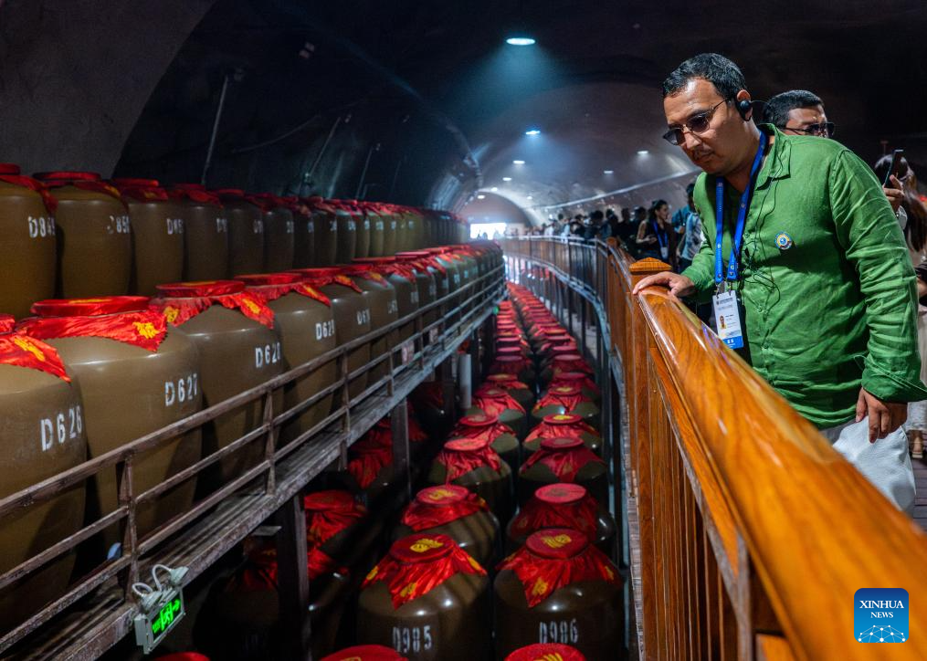 Participants of the Shanghai Cooperation Organization (SCO) Media and Think Tank Summit visit a cellar at Yangshao Xianmen Mountain scenic area in Mianchi County of Sanmenxia, central China's Henan Province, July 23, 2025. The SCO Media and Think Tank Summit is held in Zhengzhou from July 23 to 27. Participants are invited to visit various locations in Henan during the summit. (Xinhua/Hu Jingwen)