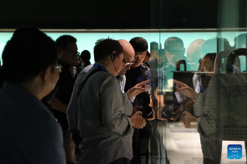 Participants of the Shanghai Cooperation Organization (SCO) Media and Think Tank Summit visit the Zhengzhou Shang Dynasty Ruins Museum in Zhengzhou, central China's Henan Province, July 23, 2025. The SCO Media and Think Tank Summit is held in Zhengzhou from July 23 to 27. Participants are invited to visit various locations in Henan during the summit. (Xinhua/Zhu Xiang)