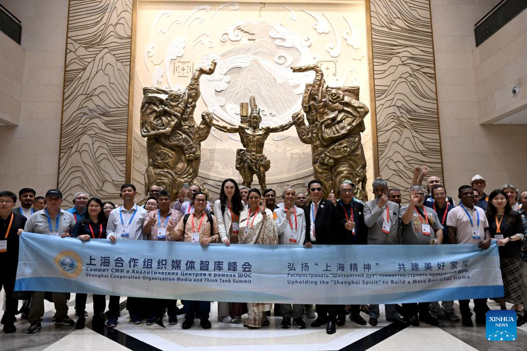 Participants of the Shanghai Cooperation Organization (SCO) Media and Think Tank Summit pose for a group photo at the Henan Museum in Zhengzhou, central China's Henan Province, July 24, 2025. The SCO Media and Think Tank Summit is held in Zhengzhou from July 23 to 27. Participants are invited to visit various locations in Henan during the summit. (Xinhua/Zhu Xiang)