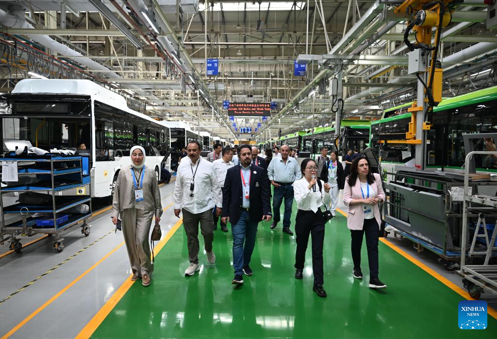 Participants of the Shanghai Cooperation Organization (SCO) Media and Think Tank Summit visit a factory of Zhengzhou Yutong Bus Co., Ltd. in Zhengzhou, central China's Henan Province, July 24, 2025. The SCO Media and Think Tank Summit is held in Zhengzhou from July 23 to 27. Participants are invited to visit various locations in Henan during the summit. (Xinhua/Li Jianan)
