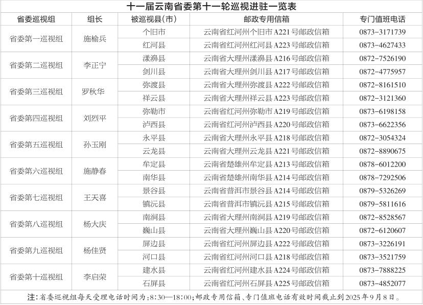 据悉,省委巡视组将在被巡视地区工作50天左右,巡视期间设专门值班电话、邮政专用信箱,主要受理反映被巡视党组织领导班子及其成员、下一级党组织主要负责人和重点岗位人员问题的来信来电来访,重点是关于违反政治纪律、组织纪律、廉洁纪律、群众纪律、工作纪律和生活纪律等方面的举报和反映。省委巡视组受理信访时间截止到2025年9月8日。云巡轩
