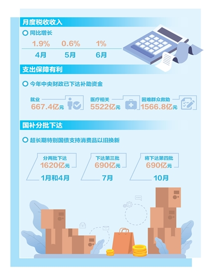 收入回升,支出有力,为落实更加积极的财政政策提供坚实资金保障。“围绕提振消费、稳就业稳经济等重点领域,财政部门加强财政政策供给和资金拨付管理,确保尽早发挥政策效果。”财政部预算司一级巡视员、政府债务研究和评估中心主任李大伟说。