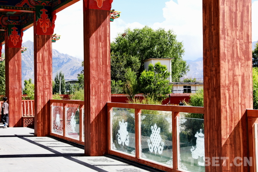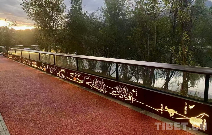 图为拉萨两岛内河绿色生态廊道上连通南北岸的廊桥护栏装饰着吉祥八宝图案 摄影:刘莉