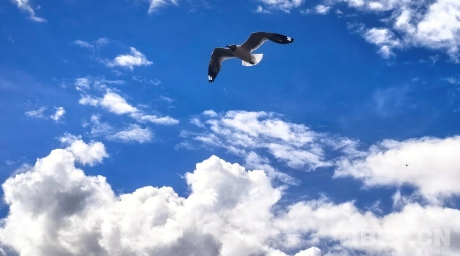 图为拉萨两岛内河绿色生态廊道一隅,水鸟在天空中飞过 摄影:刘莉