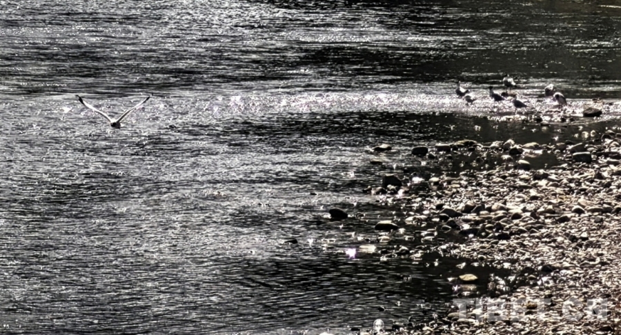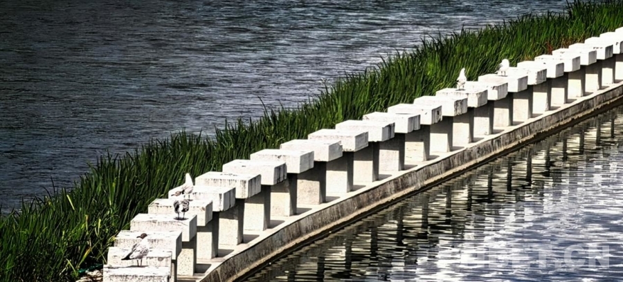 图为拉萨两岛内河绿色生态廊道一隅,水鸟栖息在河中的堤坝上 摄影:刘莉