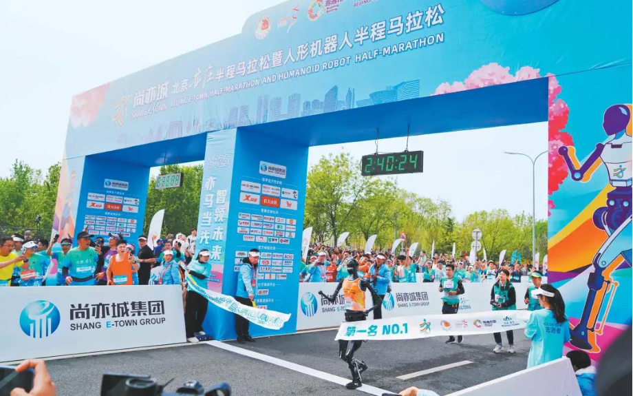 4月19日,2025北京亦庄半程马拉松暨人形机器人半程马拉松赛,“天工Ultra”机器人冲刺夺冠。这是人形机器人首次在开放环境下进行长距离耐力测试。经济日报记者翟天雪摄