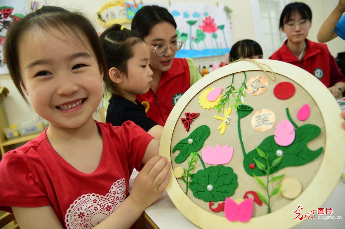 6月21日,江苏大学志愿者指导镇江市解放路幼儿园的小朋友制作"夏至节气"为主题的手工作品。(光明网 记者石玉成 摄)