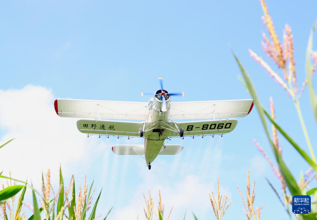 7月25日,在北大荒集团北安分公司赵光农场有限公司第五管理区玉米地号,一架农用飞机在进行航化作业。新华社发(钱泊羽摄)