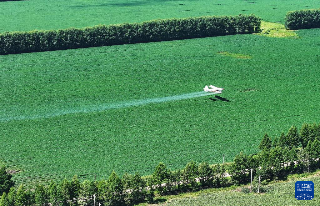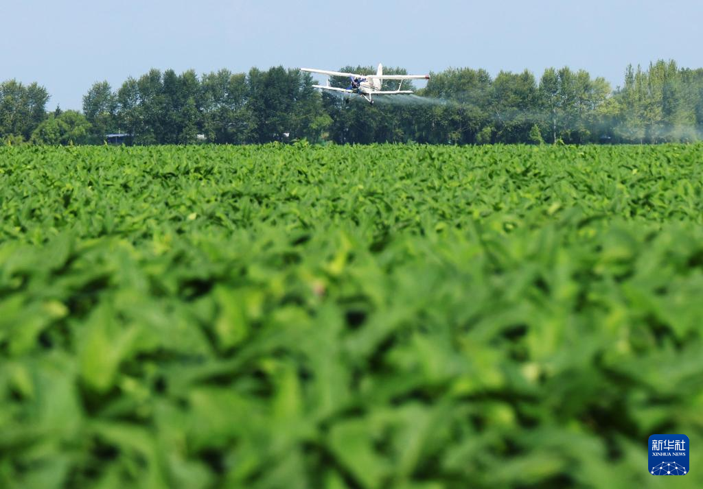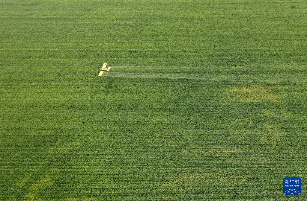 7月25日,在北大荒集团黑龙江红星农场第一管理区大豆地块,一架农用飞机在进行航化作业。新华社发(侯越摄)