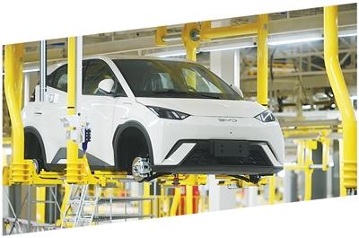 巴西巴伊亚州卡马萨里市的比亚迪工厂,一辆新能源汽车正在组装中。卢西奥·塔沃拉摄(新华社发)