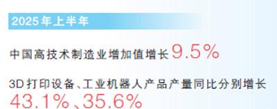 “技术驱动”“创新驱动”已成为中国经济新的增长模式。中国在新兴领域加大投资,这些领域的发展不仅为民众提供了质量更高的产品与服务,也对其他领域产生正向引导作用,创造更多的国内需求。中国推动大规模设备更新,利用大数据、人工智能等技术和自动化生产线等,对传统制造业进行自动化、智能化改造,取得积极成效。2025年上半年,中国高技术制造业增加值增长9.5%,3D打印设备、工业机器人产品产量同比分别增长43.1%、35.6%。