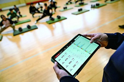 在中国农业大学,减脂课教师通过仪器实时监测学生的心率等指标。新华社发