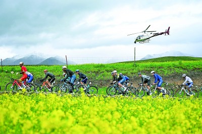 环大美青海国际公路自行车赛上,参赛选手在骑行。新华社发