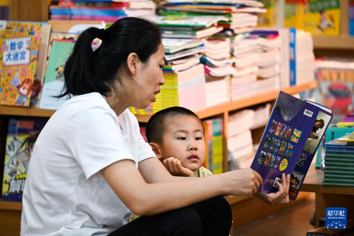 7月27日,一位家长与小朋友在呼和浩特市青城阅立方书店阅读。