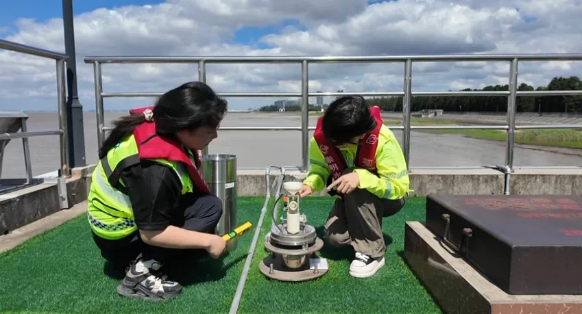 工作人员开展对水文监测站点和监测设备的检修和维护。“上海崇明”微信公众号 图