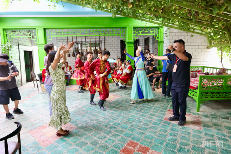 在努尔东·司马义的院落里,艺人与游客即兴共舞(央广网记者 梁瑜琳 摄)