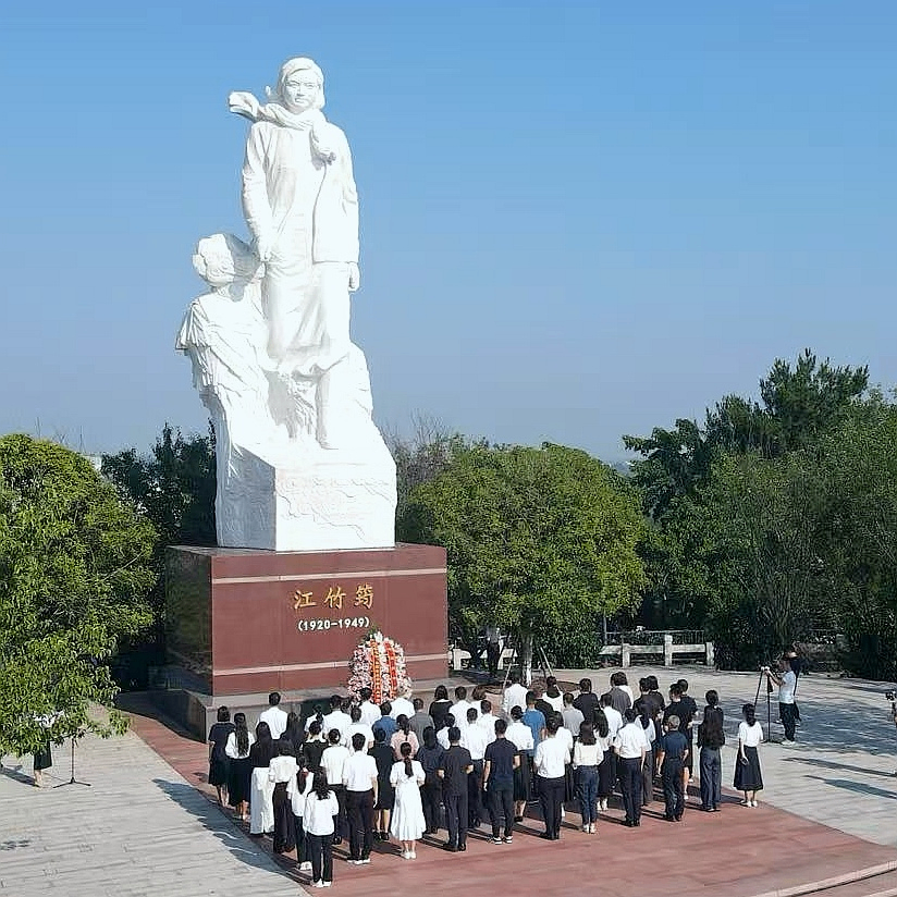 7月29日,参赛选手前往江姐故里红色教育基地,向江姐塑像敬献花篮。(主办方供图)
