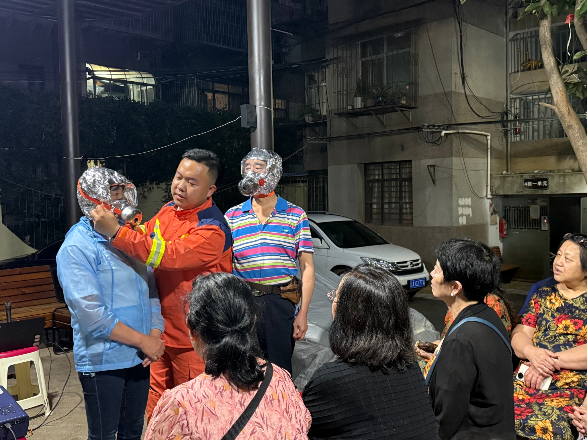 在器材演示环节,消防宣传员详细介绍了灭火器、防烟面罩等消防器材的功能和使用方法,并邀请居民上台进行实操体验。“提起灭火器,拔掉保险销,握住喷管,站在上风口,对准火焰根部,按下压把……”防烟面罩使用教学同样吸引众多居民参与,大家认真学习佩戴技巧,掌握逃生利器使用方法,学会在浓烟环境中如何有效保护自己。“女同志佩戴防烟面罩一定要把头发全部塞进去,然后绳子拉紧,才能起到防护效果。”消防宣传员补充道。