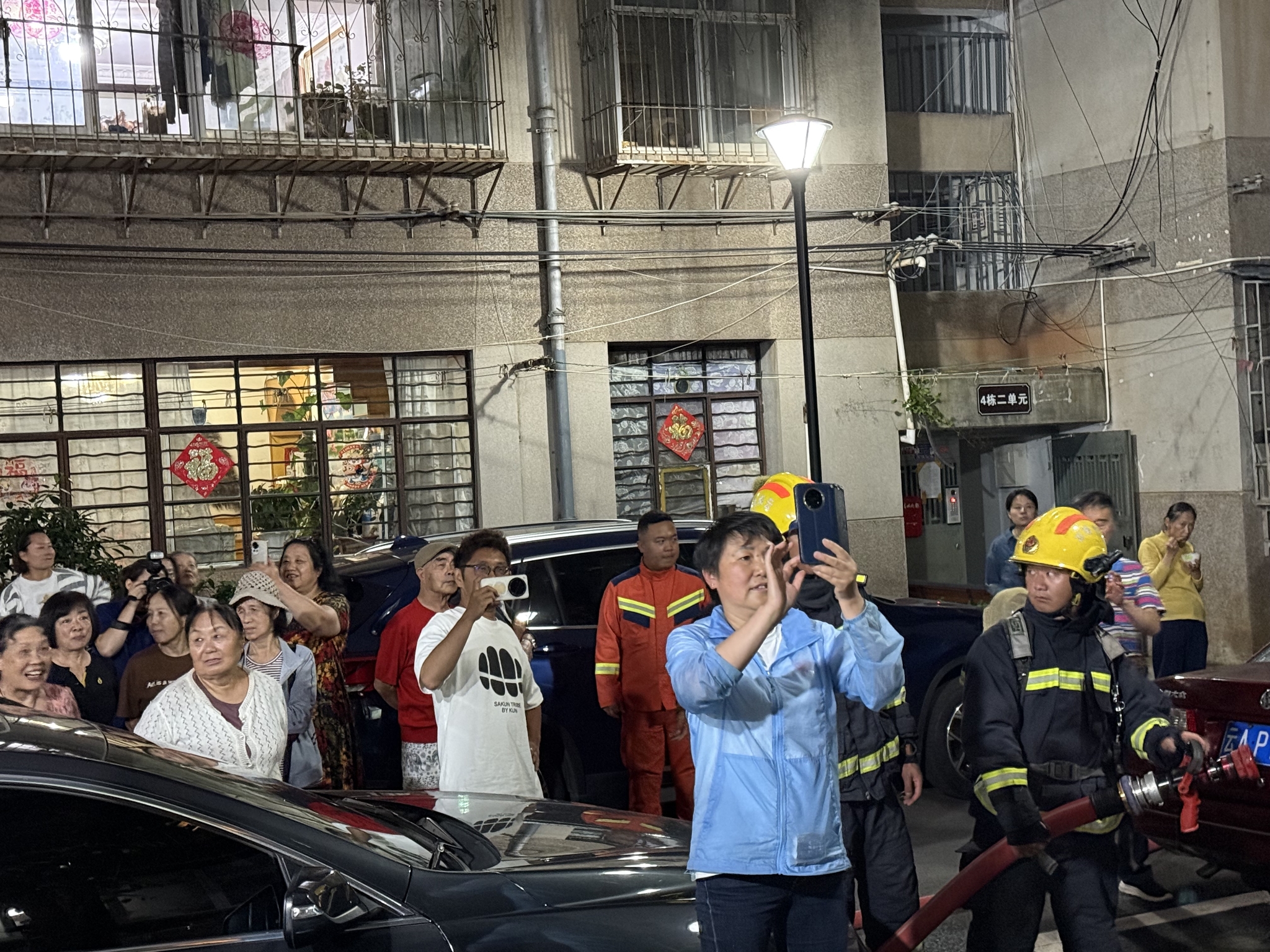 理论讲解结束后,进入了紧张刺激的实战演练环节。模拟场景设定为小区二楼一户居民家中发生火灾,有人员被困。接到居民报警后,消防救援人员迅速抵达现场,立即展开救援行动。演练现场,消防员有条不紊地实施内外侦查、疏散救人,利用拉梯现场搭建展示,保护被困人员安全撤离,让现场居民“身临其境”快速了解火灾发生时的景象,深刻认识到在火灾中“救我需要多少分钟”的紧迫性,更直观地感受在火灾威胁的紧张感、压迫感中体验报警、等待救援、疏散逃生等全过程。