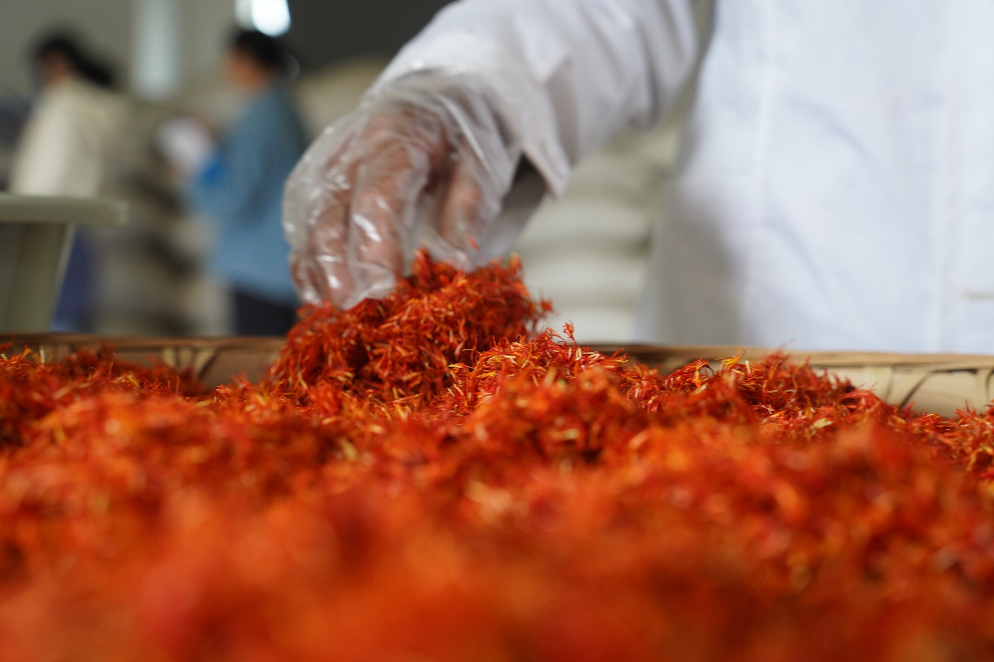 ▲在曲松镇琼嘎村藏药材种植加工专业合作社,生产车间里的草红花原料。中国网记者 胡俊 摄