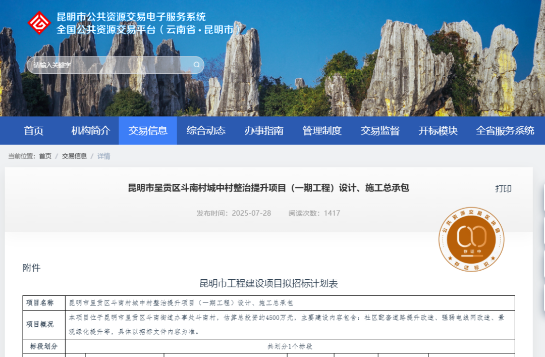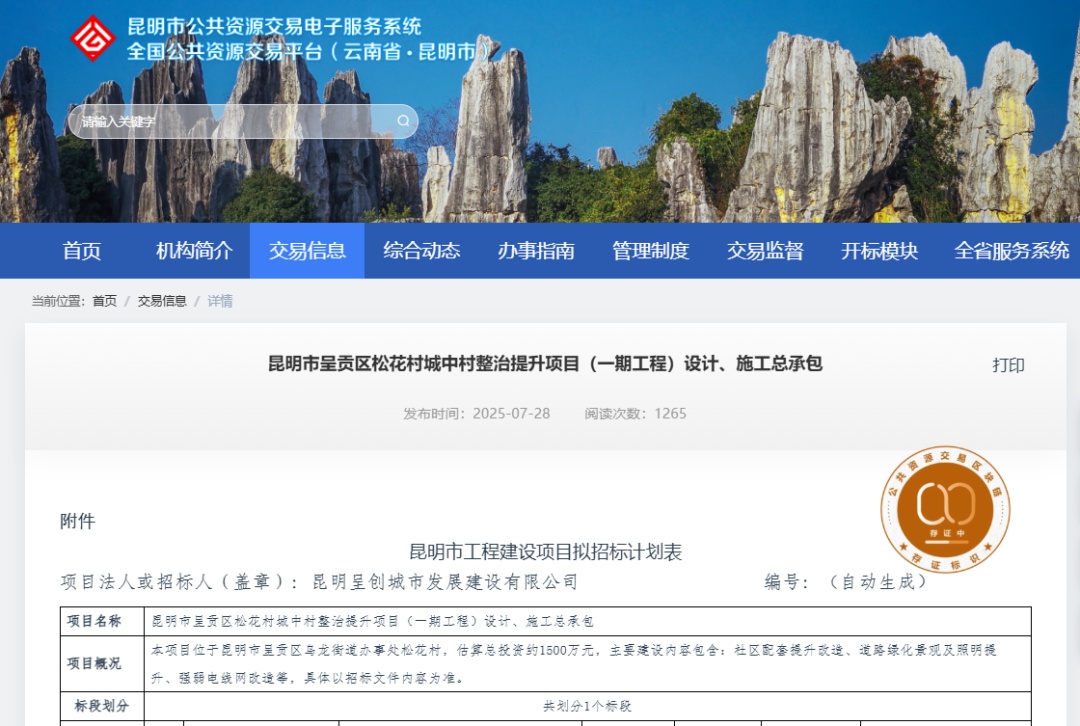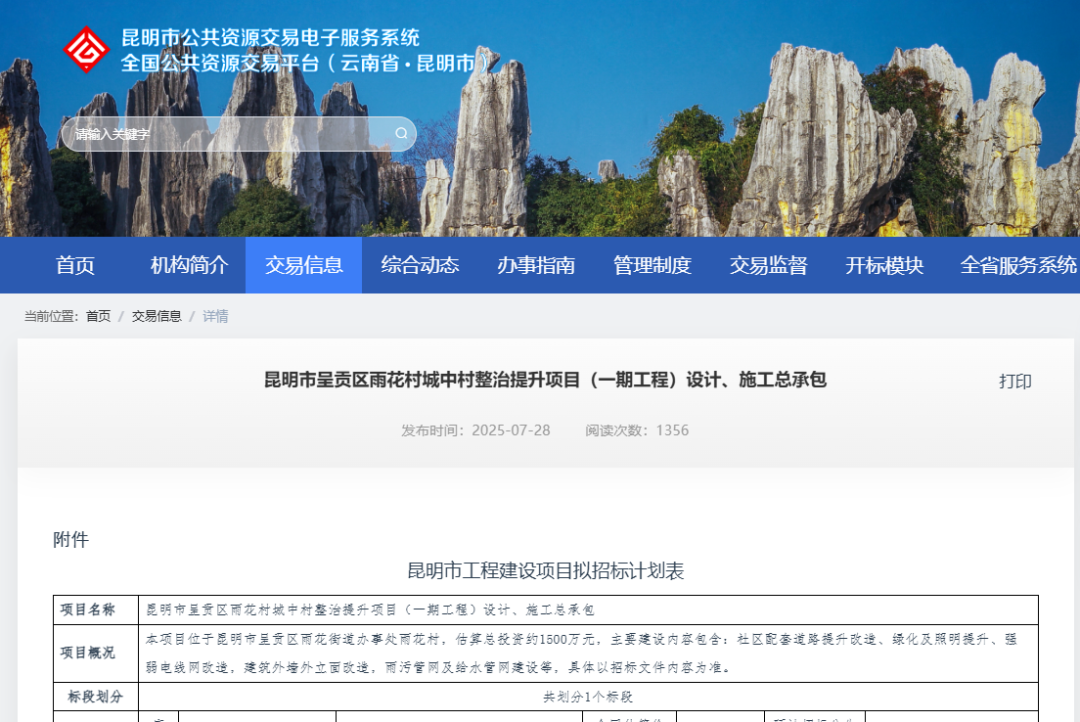7月28日,昆明市公共资源交易电子服务平台接连发布昆明市呈贡区松花村、雨花村、斗南村城中村整治提升项目(一期工程)设计、施工总承包招标公告,总投资约7500万元,标志着呈贡区城市更新进程加速推进。